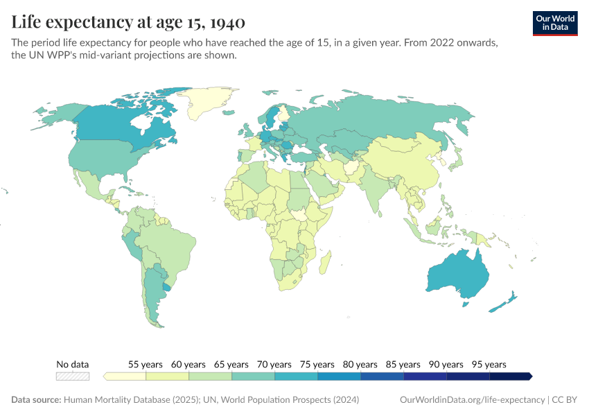 “Data Page: Life expectancy at 15”, part of the following publication: Saloni Dattani, Lucas Rodés-Guirao, Hannah Ritchie, Esteban Ortiz-Ospina, and Max Roser (2023) - “Life Expectancy”. Data adapted from Human Mortality Database, United Nations. Retrieved from https://archive.ourworldindata.org/20251022-222946/grapher/life-expectancy-at-age-15.html [online resource] (archived on October 22, 2025).How to cite this data