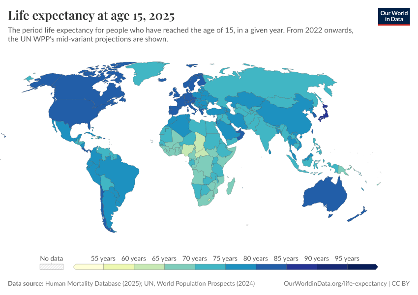 “Data Page: Life expectancy at 15”, part of the following publication: Saloni Dattani, Lucas Rodés-Guirao, Hannah Ritchie, Esteban Ortiz-Ospina, and Max Roser (2023) - “Life Expectancy”. Data adapted from Human Mortality Database, United Nations. Retrieved from https://archive.ourworldindata.org/20251022-222946/grapher/life-expectancy-at-age-15.html [online resource] (archived on October 22, 2025).