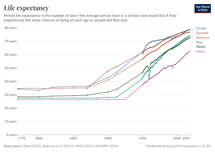 Riley (2005); Zijdeman et al. (2015); HMD (2025); UN WPP (2024) – with major processing by Our World in Data. “Life expectancy – Riley; Zijdeman et al.; HMD; UN WPP – Long-run data” [dataset]. Human Mortality Database, “Human Mortality Database”; United Nations, “World Population Prospects”; Zijdeman et al., “Life Expectancy at birth v2”; James C. Riley, “Estimates of Regional and Global Life Expectancy, 1800-2001” [original data]. Retrieved December 7, 2025 from https://archive.ourworldindata.org/20251022-222946/grapher/life-expectancy.html (archived on October 22, 2025).