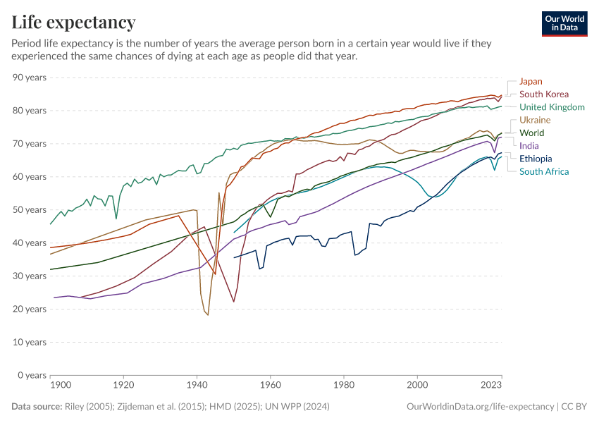 “Data Page: Life expectancy”, part of the following publication: Saloni Dattani, Lucas Rodés-Guirao, Hannah Ritchie, Esteban Ortiz-Ospina, and Max Roser (2023) - “Life Expectancy”. Data adapted from Human Mortality Database, United Nations, Zijdeman et al., James C. Riley. Retrieved from https://archive.ourworldindata.org/20251022-222946/grapher/life-expectancy.html [online resource] (archived on October 22, 2025).