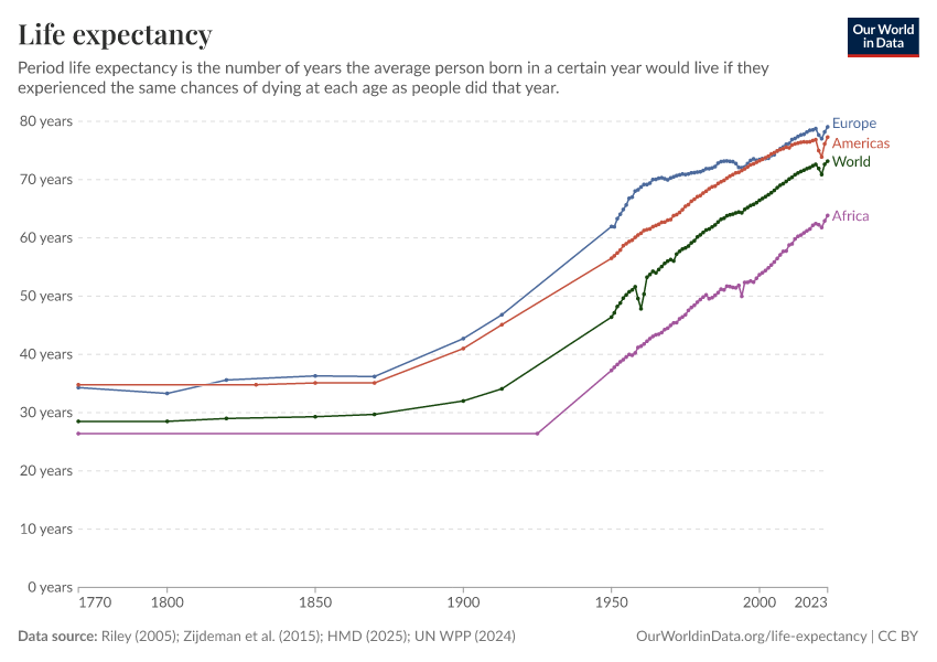Riley (2005); Zijdeman et al. (2015); HMD (2025); UN WPP (2024) – with major processing by Our World in Data. “Life expectancy – Riley; Zijdeman et al.; HMD; UN WPP – Long-run data” [dataset]. Human Mortality Database, “Human Mortality Database”; United Nations, “World Population Prospects”; Zijdeman et al., “Life Expectancy at birth v2”; James C. Riley, “Estimates of Regional and Global Life Expectancy, 1800-2001” [original data]. Retrieved January 23, 2026 from https://archive.ourworldindata.org/20251022-222946/grapher/life-expectancy.html (archived on October 22, 2025).
