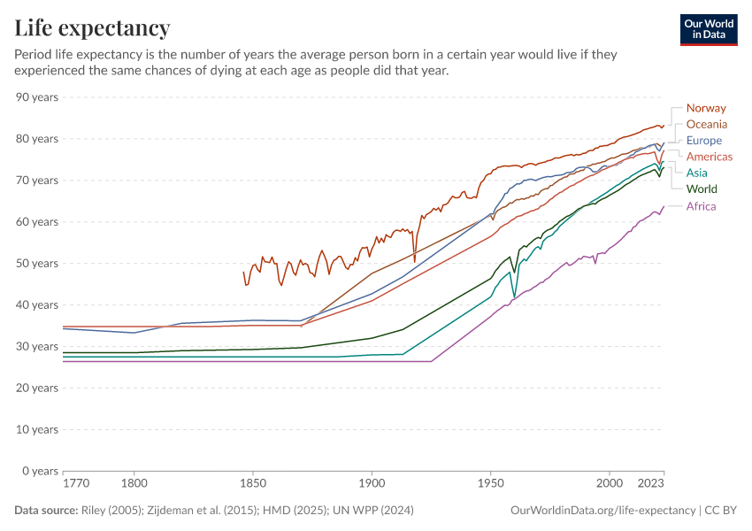 “Data Page: Life expectancy”, part of the following publication: Saloni Dattani, Lucas Rodés-Guirao, Hannah Ritchie, Esteban Ortiz-Ospina, and Max Roser (2023) - “Life Expectancy”. Data adapted from Human Mortality Database, United Nations, Zijdeman et al., James C. Riley. Retrieved from https://archive.ourworldindata.org/20251022-222946/grapher/life-expectancy.html [online resource] (archived on October 22, 2025).How to cite this data