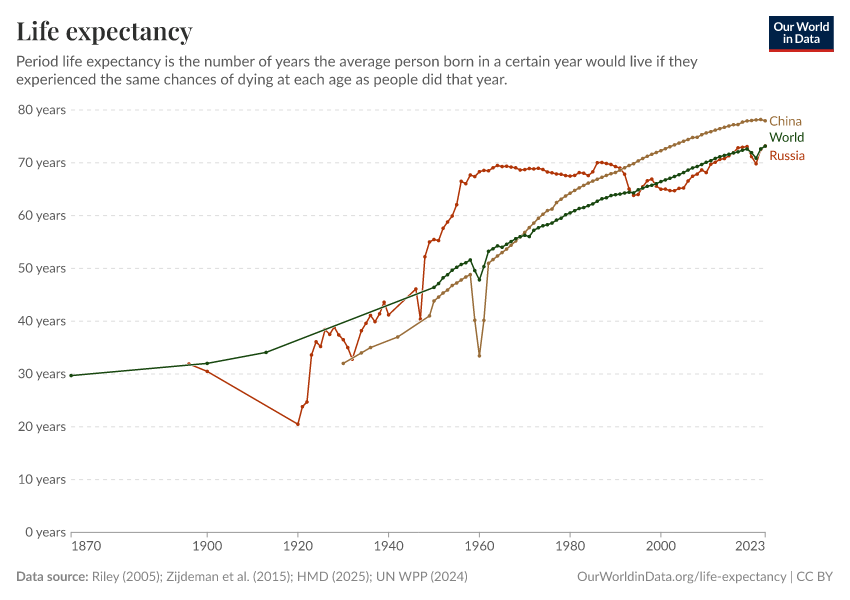 “Data Page: Life expectancy”, part of the following publication: Saloni Dattani, Lucas Rodés-Guirao, Hannah Ritchie, Esteban Ortiz-Ospina, and Max Roser (2023) - “Life Expectancy”. Data adapted from Human Mortality Database, United Nations, Zijdeman et al., James C. Riley. Retrieved from https://archive.ourworldindata.org/20251022-222946/grapher/life-expectancy.html [online resource] (archived on October 22, 2025).How to cite this data