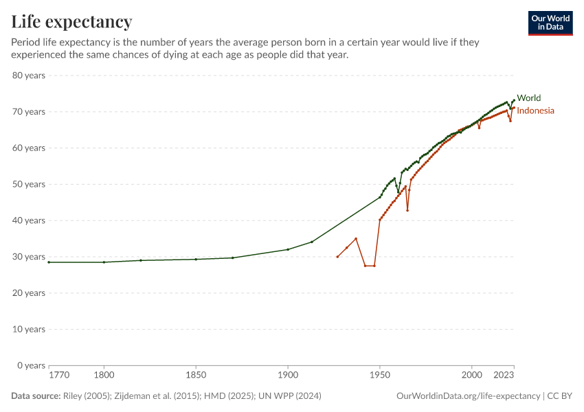 “Data Page: Life expectancy”, part of the following publication: Saloni Dattani, Lucas Rodés-Guirao, Hannah Ritchie, Esteban Ortiz-Ospina, and Max Roser (2023) - “Life Expectancy”. Data adapted from Human Mortality Database, United Nations, Zijdeman et al., James C. Riley. Retrieved from https://archive.ourworldindata.org/20251022-222946/grapher/life-expectancy.html [online resource] (archived on October 22, 2025).