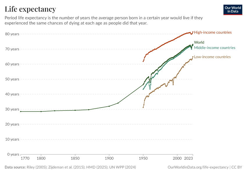 Riley (2005); Zijdeman et al. (2015); HMD (2025); UN WPP (2024) – with major processing by Our World in Data. “Life expectancy – Riley; Zijdeman et al.; HMD; UN WPP – Long-run data” [dataset]. Human Mortality Database, “Human Mortality Database”; United Nations, “World Population Prospects”; Zijdeman et al., “Life Expectancy at birth v2”; James C. Riley, “Estimates of Regional and Global Life Expectancy, 1800-2001” [original data]. Retrieved December 8, 2025 from https://archive.ourworldindata.org/20251022-222946/grapher/life-expectancy.html (archived on October 22, 2025).