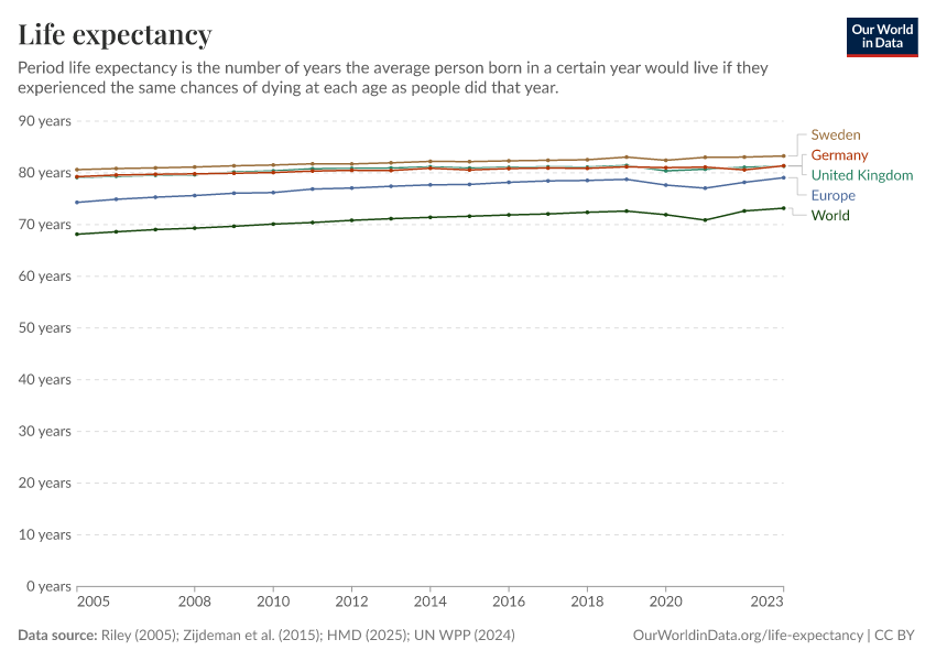 “Data Page: Life expectancy”, part of the following publication: Saloni Dattani, Lucas Rodés-Guirao, Hannah Ritchie, Esteban Ortiz-Ospina, and Max Roser (2023) - “Life Expectancy”. Data adapted from Human Mortality Database, United Nations, Zijdeman et al., James C. Riley. Retrieved from https://archive.ourworldindata.org/20260304-094028/grapher/life-expectancy.html [online resource] (archived on March 4, 2026).How to cite this data