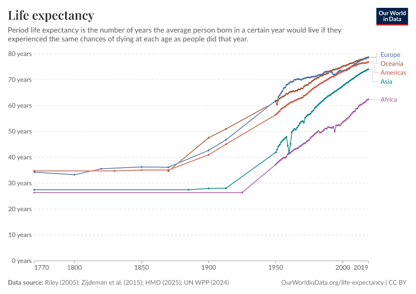 - This chart shows long-run estimates of life expectancy compiled by our team from several data sources. Before 1950, for country-level data, we rely on the Human Mortality Database (2025) combined with Zijdeman (2015). For regional data, we use Riley (2005). From 1950 onward, we use the United Nations World Population Prospects (2024).