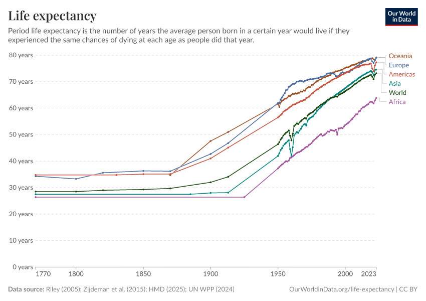 Riley (2005); Zijdeman et al. (2015); HMD (2025); UN WPP (2024) – with major processing by Our World in Data. “Life expectancy – Riley; Zijdeman et al.; HMD; UN WPP – Long-run data” [dataset]. Human Mortality Database, “Human Mortality Database”; United Nations, “World Population Prospects”; Zijdeman et al., “Life Expectancy at birth v2”; James C. Riley, “Estimates of Regional and Global Life Expectancy, 1800-2001” [original data]. Retrieved December 25, 2025 from https://archive.ourworldindata.org/20251022-222946/grapher/life-expectancy.html (archived on October 22, 2025).