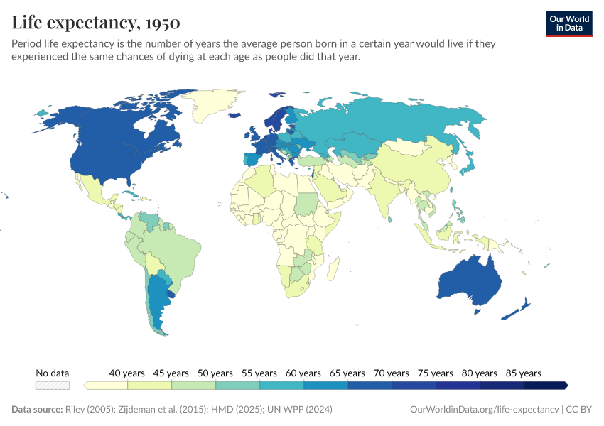 - This chart shows long-run estimates of life expectancy compiled by our team from several data sources. Before 1950, for country-level data, we rely on the Human Mortality Database (2025) combined with Zijdeman (2015). For regional data, we use Riley (2005). From 1950 onward, we use the United Nations World Population Prospects (2024).