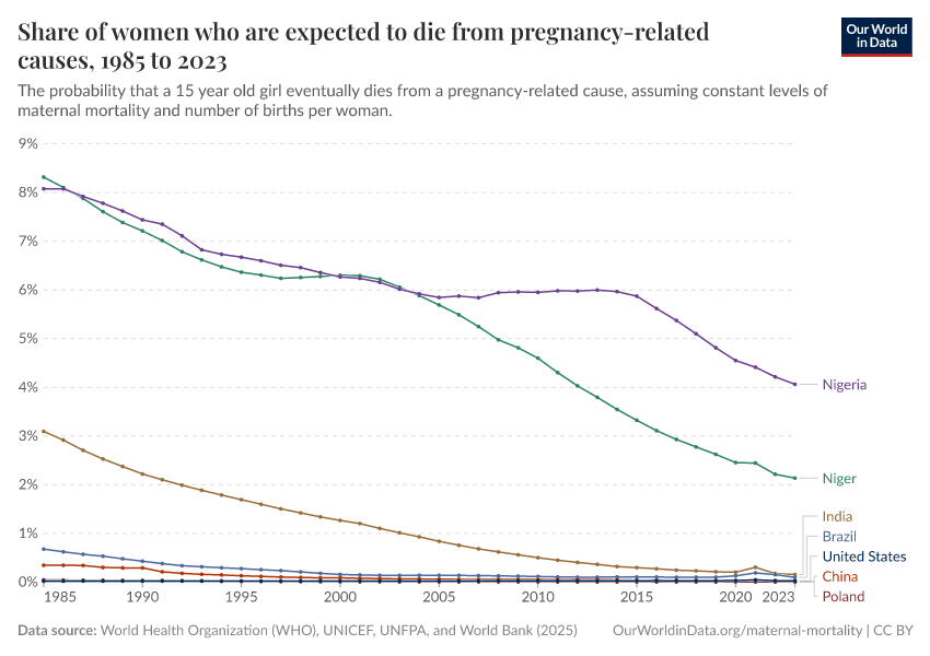“Data Page: Share of women who are expected to die from pregnancy-related causes”. Our World in Data (2025). Data adapted from World Health Organization (WHO), UNICEF, UNFPA, and World Bank. Retrieved from https://archive.ourworldindata.org/20250916-102301/grapher/lifetime-risk-of-maternal-death.html [online resource] (archived on September 16, 2025).How to cite this data