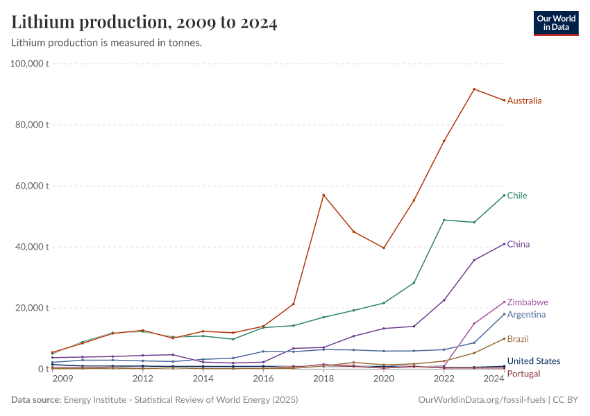 “Data Page: Lithium production”, part of the following publication: Hannah Ritchie, Pablo Rosado, and Max Roser (2023) - “Energy”. Data adapted from Energy Institute. Retrieved from https://archive.ourworldindata.org/20250909-093708/grapher/lithium-production.html [online resource] (archived on September 9, 2025).How to cite this data