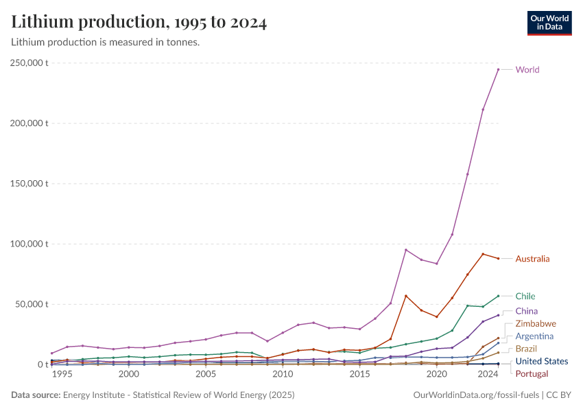 “Data Page: Lithium production”, part of the following publication: Hannah Ritchie, Pablo Rosado, and Max Roser (2023) - “Energy”. Data adapted from Energy Institute. Retrieved from https://archive.ourworldindata.org/20250909-093708/grapher/lithium-production.html [online resource] (archived on September 9, 2025).How to cite this data
