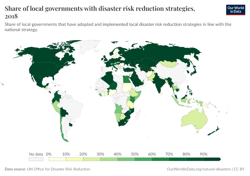 “Data Page: Share of local governments with disaster risk reduction strategies”. Our World in Data (2026). Data adapted from UN Office for Disaster Risk Reduction. Retrieved from https://archive.ourworldindata.org/20251120-211749/grapher/local-govts-risk-reduction.html [online resource] (archived on November 20, 2025).How to cite this data