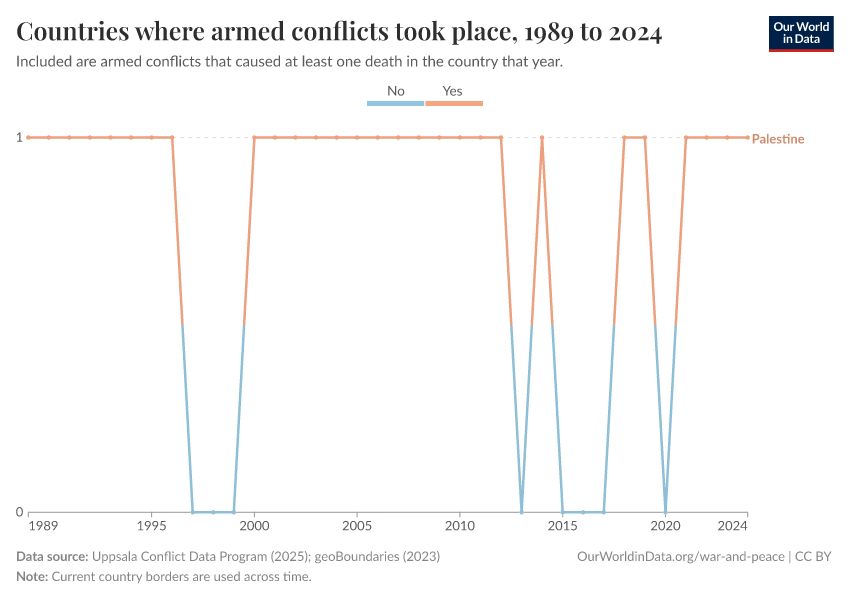 “Data Page: Countries where armed conflicts took place”, part of the following publication: Bastian Herre, Lucas Rodés-Guirao, and Max Roser (2024) - “War and Peace”. Data adapted from Uppsala Conflict Data Program, geoBoundaries. Retrieved from https://archive.ourworldindata.org/20250909-093708/grapher/locations-of-ongoing-armed-conflicts.html [online resource] (archived on September 9, 2025).