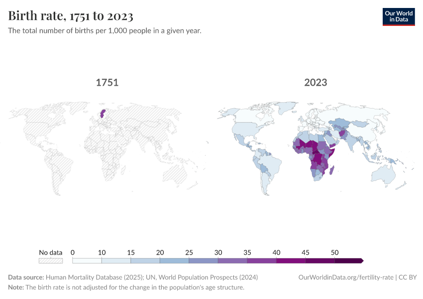 “Data Page: Birth rate”, part of the following publication: Saloni Dattani, Lucas Rodés-Guirao, and Max Roser (2025) - “Fertility Rate”. Data adapted from Human Mortality Database, United Nations. Retrieved from https://archive.ourworldindata.org/20251022-222946/grapher/long-run-birth-rate.html [online resource] (archived on October 22, 2025).How to cite this data