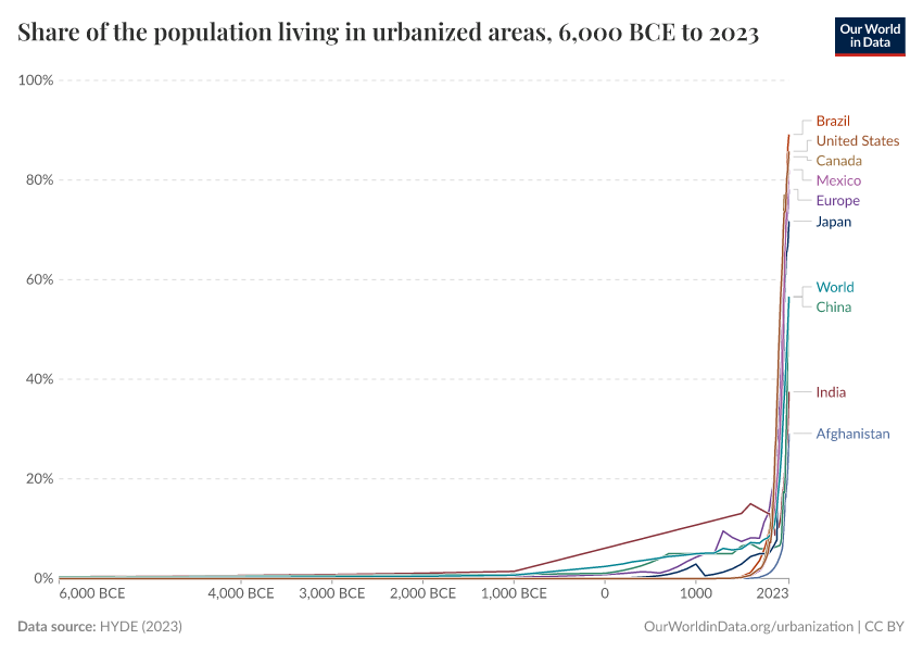 HYDE (2023) – with minor processing by Our World in Data. “Share of the population living in urbanized areas” [dataset]. PBL Netherlands Environmental Assessment Agency, “History Database of the Global Environment 3.3” [original data]. Retrieved November 10, 2025 from https://archive.ourworldindata.org/20250909-093708/grapher/long-term-urban-population-region.html (archived on September 9, 2025).