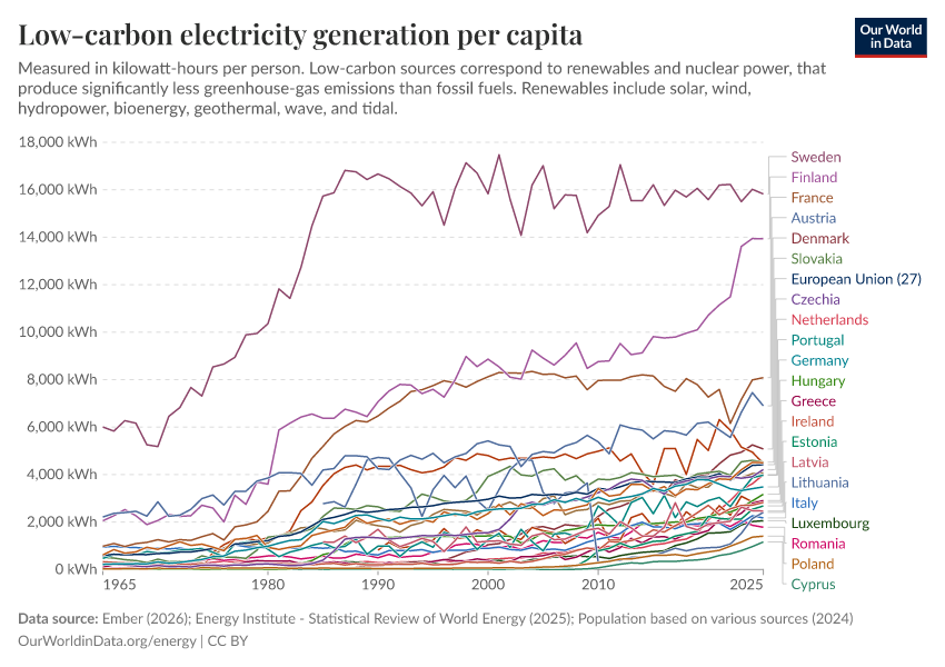 “Data Page: Electricity generation from low-carbon sources per person”, part of the following publication: Hannah Ritchie, Pablo Rosado, and Max Roser (2023) - “Energy”. Data adapted from Ember, Energy Institute, Various sources. Retrieved from https://archive.ourworldindata.org/20260304-094028/grapher/low-carbon-elec-per-capita.html [online resource] (archived on March 4, 2026).How to cite this data
