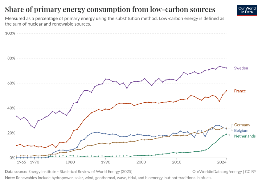 Energy Institute - Statistical Review of World Energy (2025) – with major processing by Our World in Data. “Share of primary energy consumption that comes from low-carbon sources – Using the substitution method” [dataset]. Energy Institute, “Statistical Review of World Energy” [original data]. Retrieved December 8, 2025 from https://archive.ourworldindata.org/20250909-093708/grapher/low-carbon-share-energy.html (archived on September 9, 2025).