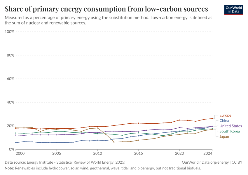 Energy Institute - Statistical Review of World Energy (2025) – with major processing by Our World in Data. “Share of primary energy consumption that comes from low-carbon sources – Using the substitution method” [dataset]. Energy Institute, “Statistical Review of World Energy” [original data]. Retrieved March 6, 2026 from https://archive.ourworldindata.org/20260304-094028/grapher/low-carbon-share-energy.html (archived on March 4, 2026).