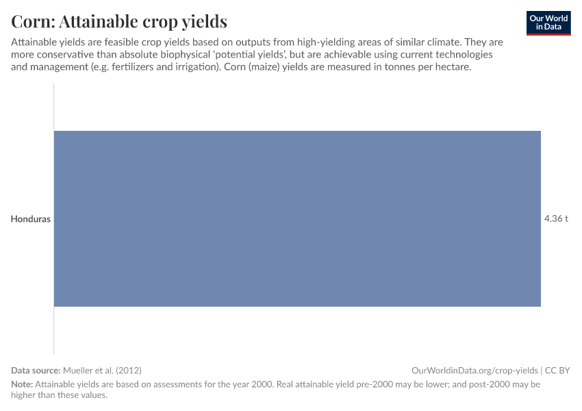 “Data Page: Corn: Attainable crop yields”, part of the following publication: Hannah Ritchie, Pablo Rosado, and Max Roser (2022) - “Crop Yields”. Data adapted from Mueller et al.. Retrieved from https://archive.ourworldindata.org/20250909-093708/grapher/maize-attainable-yield.html [online resource] (archived on September 9, 2025).How to cite this data