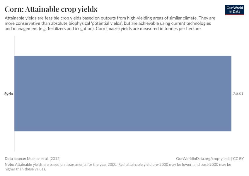“Data Page: Corn: Attainable crop yields”, part of the following publication: Hannah Ritchie, Pablo Rosado, and Max Roser (2022) - “Crop Yields”. Data adapted from Mueller et al.. Retrieved from https://archive.ourworldindata.org/20250909-093708/grapher/maize-attainable-yield.html [online resource] (archived on September 9, 2025).