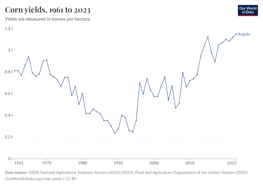 “Data Page: Corn yields”, part of the following publication: Hannah Ritchie, Pablo Rosado, and Max Roser (2022) - “Crop Yields”. Data adapted from USDA National Agricultural Statistics Service (NASS), Food and Agriculture Organization of the United Nations. Retrieved from https://archive.ourworldindata.org/20251014-161652/grapher/maize-yields.html [online resource] (archived on October 14, 2025).How to cite this data