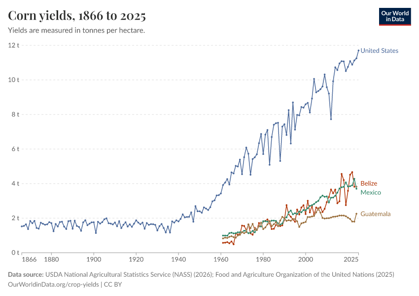 USDA National Agricultural Statistics Service (NASS) (2026); Food and Agriculture Organization of the United Nations (2025) – with major processing by Our World in Data. “Corn yields – USDA/NASS” [dataset]. USDA National Agricultural Statistics Service (NASS), “Long-term corn yields in United States”; Food and Agriculture Organization of the United Nations, “Production: Crops and livestock products” [original data]. Retrieved April 7, 2026 from https://archive.ourworldindata.org/20260304-110441/grapher/maize-yields.html (archived on March 4, 2026).Download