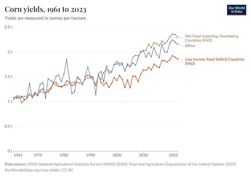 “Data Page: Corn yields”, part of the following publication: Hannah Ritchie, Pablo Rosado, and Max Roser (2022) - “Crop Yields”. Data adapted from USDA National Agricultural Statistics Service (NASS), Food and Agriculture Organization of the United Nations. Retrieved from https://archive.ourworldindata.org/20251014-161652/grapher/maize-yields.html [online resource] (archived on October 14, 2025).How to cite this data