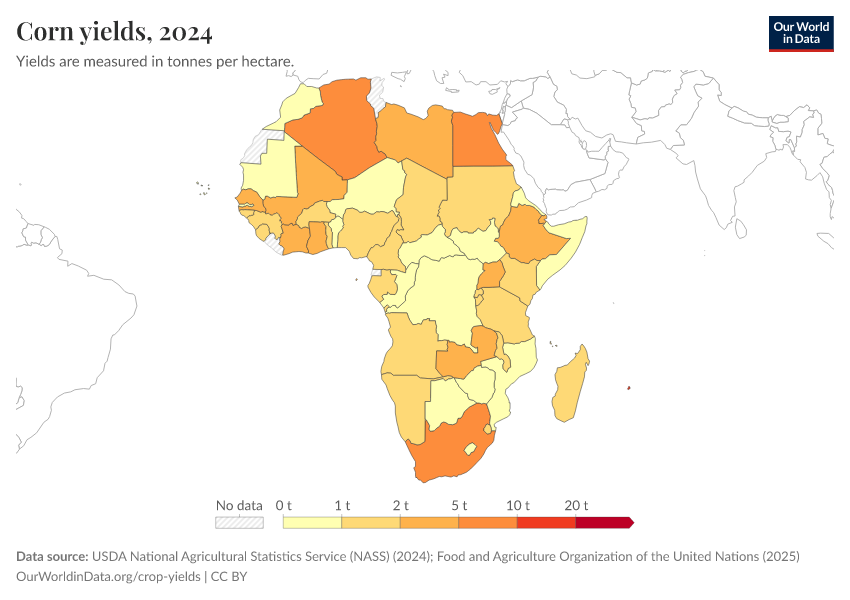 “Data Page: Corn yields”, part of the following publication: Hannah Ritchie, Pablo Rosado, and Max Roser (2022) - “Crop Yields”. Data adapted from USDA National Agricultural Statistics Service (NASS), Food and Agriculture Organization of the United Nations. Retrieved from https://archive.ourworldindata.org/20251014-161652/grapher/maize-yields.html [online resource] (archived on October 14, 2025).How to cite this data