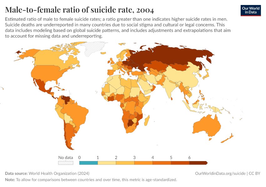 World Health Organization (2024) – with major processing by Our World in Data. “Male-to-female ratio of suicide rate” [dataset]. World Health Organization, “Global Health Estimates” [original data]. Retrieved December 24, 2025 from https://archive.ourworldindata.org/20250909-093708/grapher/male-female-ratio-suicides-rates.html (archived on September 9, 2025).