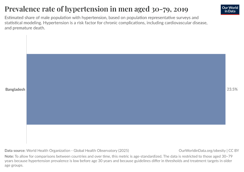 “Data Page: Prevalence rate of hypertension in men aged 30-79”. Our World in Data (2026). Data adapted from World Health Organization. Retrieved from https://archive.ourworldindata.org/20250909-093708/grapher/male-high-blood-pressure.html [online resource] (archived on September 9, 2025).How to cite this data