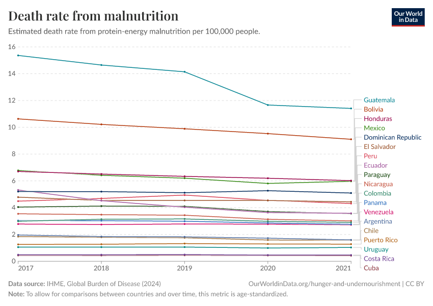 IHME, Global Burden of Disease (2024) – with minor processing by Our World in Data. “Death rate from malnutrition” [dataset]. IHME, Global Burden of Disease, “Global Burden of Disease - Deaths and DALYs” [original data]. Retrieved December 11, 2025 from https://archive.ourworldindata.org/20250909-093708/grapher/malnutrition-death-rates.html (archived on September 9, 2025).