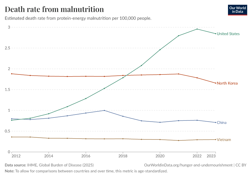 IHME, Global Burden of Disease (2025) – with major processing by Our World in Data. “Death rate from malnutrition – IHME” [dataset]. IHME, Global Burden of Disease, “Global Burden of Disease - Deaths” [original data]. Retrieved March 29, 2026 from https://archive.ourworldindata.org/20260323-161325/grapher/malnutrition-death-rates.html (archived on March 23, 2026).
