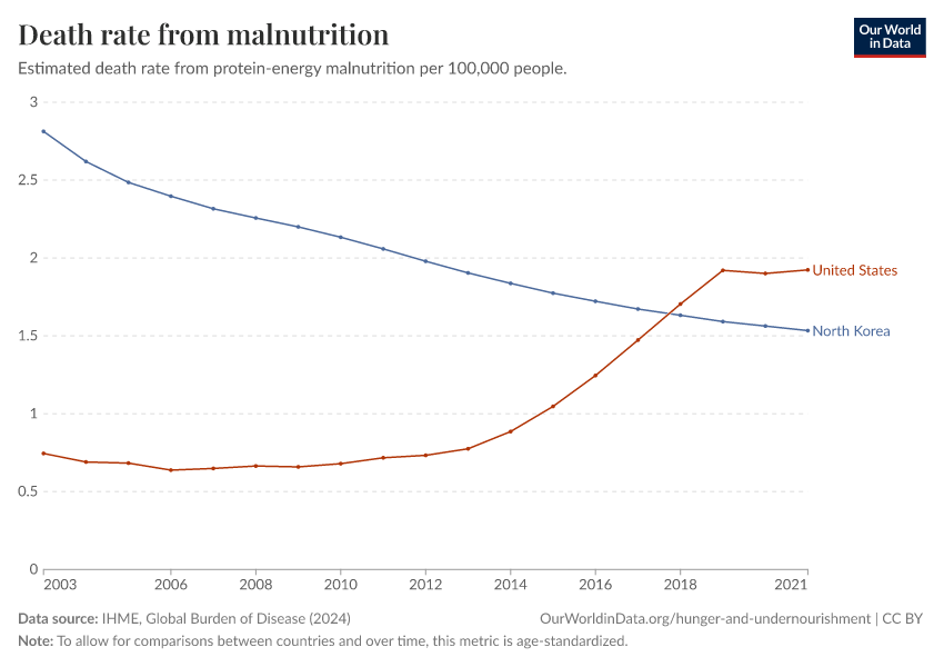IHME, Global Burden of Disease (2024) – with minor processing by Our World in Data. “Death rate from malnutrition” [dataset]. IHME, Global Burden of Disease, “Global Burden of Disease - Deaths and DALYs” [original data]. Retrieved February 1, 2026 from https://archive.ourworldindata.org/20250909-093708/grapher/malnutrition-death-rates.html (archived on September 9, 2025).