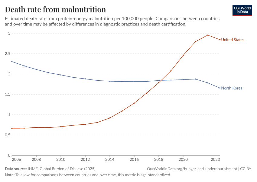 IHME, Global Burden of Disease (2025) – with major processing by Our World in Data. “Death rate from malnutrition – IHME” [dataset]. IHME, Global Burden of Disease, “Global Burden of Disease - Deaths” [original data]. Retrieved April 4, 2026 from https://archive.ourworldindata.org/20260330-095951/grapher/malnutrition-death-rates.html (archived on March 30, 2026).