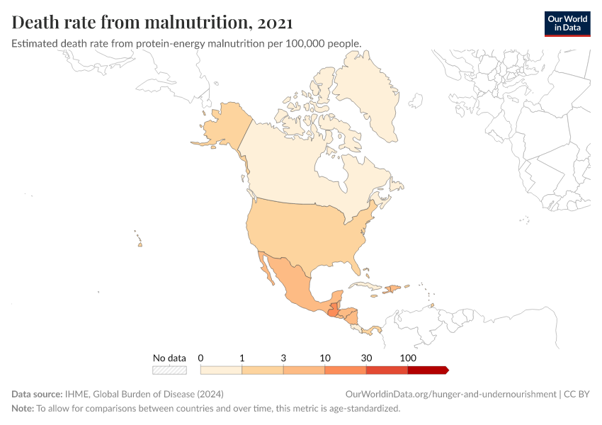 IHME, Global Burden of Disease (2024) – with minor processing by Our World in Data. “Death rate from malnutrition” [dataset]. IHME, Global Burden of Disease, “Global Burden of Disease - Deaths and DALYs” [original data]. Retrieved December 14, 2025 from https://archive.ourworldindata.org/20250909-093708/grapher/malnutrition-death-rates.html (archived on September 9, 2025).