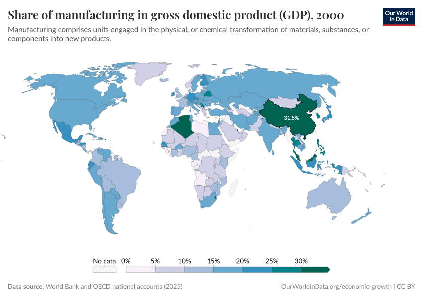 “Data Page: Share of manufacturing in gross domestic product (GDP)”. Our World in Data (2025). Data adapted from World Bank and OECD national accounts. Retrieved from https://archive.ourworldindata.org/20250916-102301/grapher/manufacturing-value-added-to-gdp.html [online resource] (archived on September 16, 2025).How to cite this data