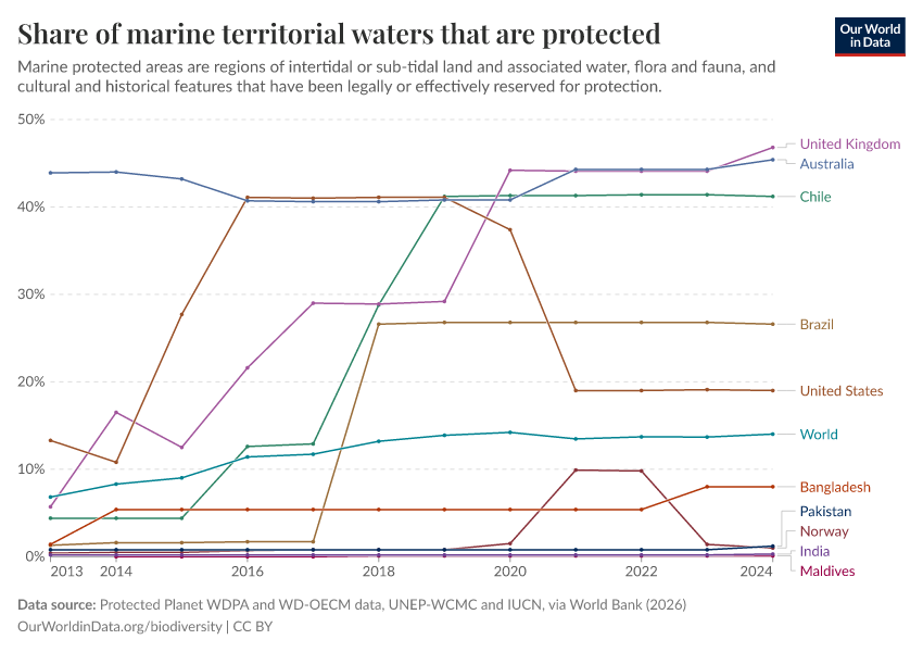 “Data Page: Share of marine territorial waters that are protected”. Our World in Data (2026). Data adapted from Protected Planet WDPA and WD-OECM data, UNEP-WCMC and IUCN, via World Bank. Retrieved from https://archive.ourworldindata.org/20260304-094028/grapher/marine-protected-areas.html [online resource] (archived on March 4, 2026).How to cite this data