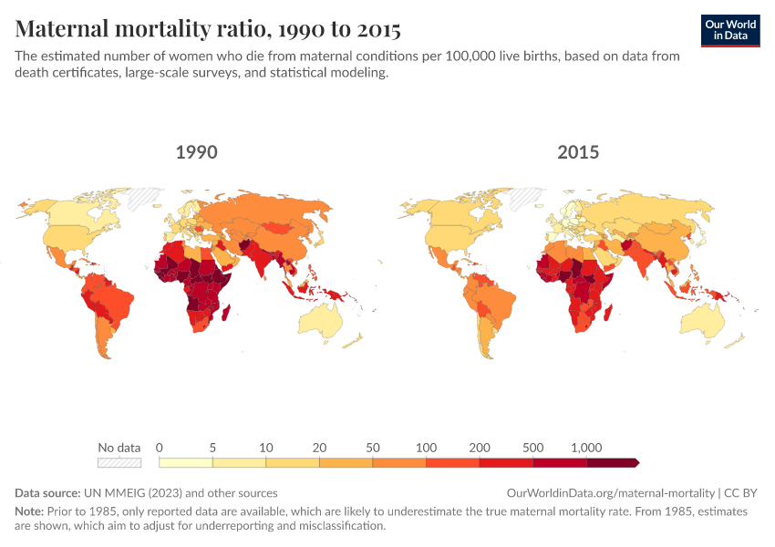 “Data Page: Maternal mortality ratio”, part of the following publication: Max Roser and Hannah Ritchie (2013) - “Maternal Mortality”. Data adapted from UN MMEIG (WHO, UNICEF, UNFPA, World Bank Group and UNDESA/ Population Division), WHO Mortality Database, United Nations, Gapminder. Retrieved from https://archive.ourworldindata.org/20260402-173937/grapher/maternal-mortality.html [online resource] (archived on April 2, 2026).