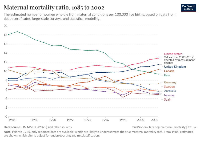 - The dataset combines three sources: WHO Mortality Database (before 1985), Gapminder (before 1985, if WHO Mortality Database data are unavailable), UN MMEIG (1985 onwards). The WHO Mortality Database and Gapminder contain reported figures from countries, and are likely to underestimate the true maternal mortality figures. The UN MMEIG aims to estimates the true rate, by adjusting for underreporting and misclassification. Sudden jumps in mortality rate in 1985 are a consequence of switching data sources (from reported to estimated figures).