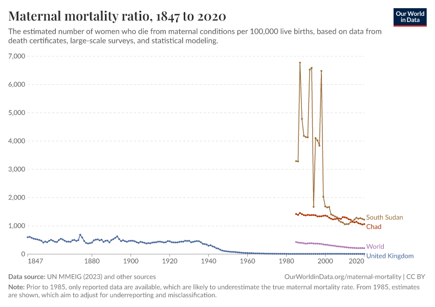 “Data Page: Maternal mortality ratio”, part of the following publication: Max Roser and Hannah Ritchie (2013) - “Maternal Mortality”. Data adapted from UN MMEIG (WHO, UNICEF, UNFPA, World Bank Group and UNDESA/ Population Division), WHO Mortality Database, United Nations, Gapminder. Retrieved from https://archive.ourworldindata.org/20251209-133038/grapher/maternal-mortality.html [online resource] (archived on December 9, 2025).How to cite this data