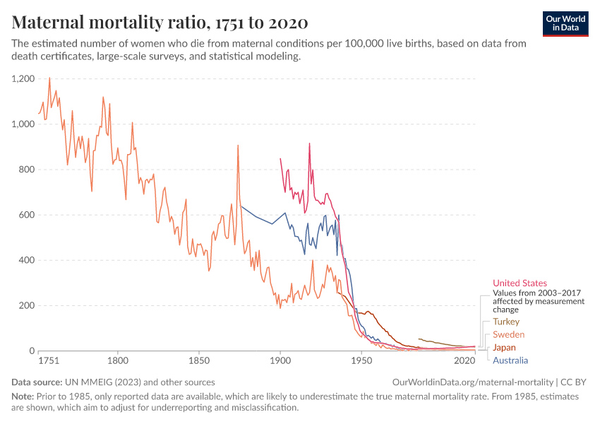 UN MMEIG (2023); WHO Mortality Database (2025); UN, World Population Prospects (2024); Gapminder (2010) – with major processing by Our World in Data. “Maternal mortality ratio” [dataset]. UN MMEIG (WHO, UNICEF, UNFPA, World Bank Group and UNDESA/ Population Division), “Trends in maternal mortality 2020”; WHO Mortality Database, “WHO Mortality Database”; United Nations, “World Population Prospects”; United Nations, “World Population Prospects - Interim Update”; Gapminder, “Maternal mortality ratio V1” [original data]. Retrieved April 4, 2026 from https://archive.ourworldindata.org/20260402-173937/grapher/maternal-mortality.html (archived on April 2, 2026).