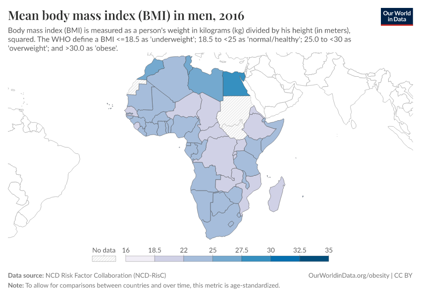 “Data Page: Mean body mass index (BMI) in men”. Our World in Data (2026). Data adapted from World Health Organization. Retrieved from https://archive.ourworldindata.org/20260112-120119/grapher/mean-body-mass-index-bmi-in-adult-males.html [online resource] (archived on January 12, 2026).How to cite this data