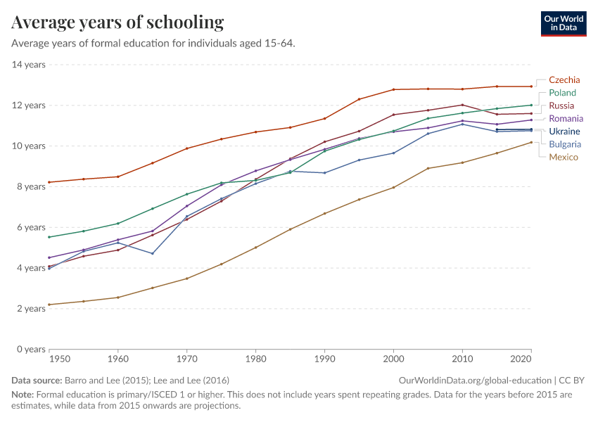“Data Page: Average years of schooling”, part of the following publication: Hannah Ritchie, Veronika Samborska, Esteban Ortiz-Ospina, and Max Roser (2023) - “Global Education”. Data adapted from Barro and Lee, Lee and Lee. Retrieved from https://archive.ourworldindata.org/20260119-070102/grapher/mean-years-of-schooling-long-run.html [online resource] (archived on January 19, 2026).How to cite this data