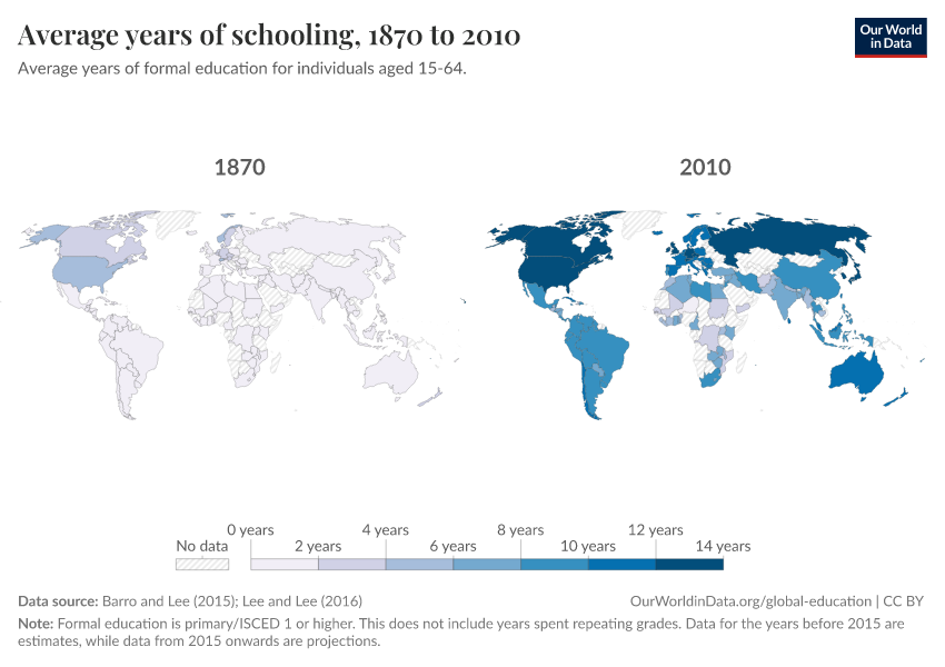 “Data Page: Average years of schooling”, part of the following publication: Hannah Ritchie, Veronika Samborska, Esteban Ortiz-Ospina, and Max Roser (2023) - “Global Education”. Data adapted from Barro and Lee, Lee and Lee. Retrieved from https://archive.ourworldindata.org/20260417-112857/grapher/mean-years-of-schooling-long-run.html [online resource] (archived on April 17, 2026).