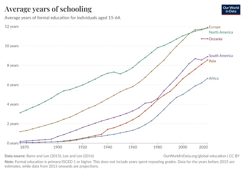 Barro and Lee (2015); Lee and Lee (2016) – with major processing by Our World in Data. “Average years of schooling” [dataset]. Barro and Lee, “Projections of Educational Attainment”; Lee and Lee, “Human Capital in the Long Run” [original data]. Retrieved February 25, 2026 from https://archive.ourworldindata.org/20260119-070102/grapher/mean-years-of-schooling-long-run.html (archived on January 19, 2026).