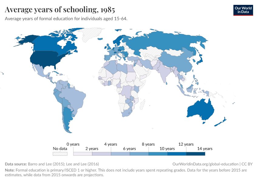 Barro and Lee (2015); Lee and Lee (2016) – with major processing by Our World in Data. “Average years of schooling” [dataset]. Barro and Lee, “Projections of Educational Attainment”; Lee and Lee, “Human Capital in the Long Run” [original data]. Retrieved December 16, 2025 from https://archive.ourworldindata.org/20250909-093708/grapher/mean-years-of-schooling-long-run.html (archived on September 9, 2025).