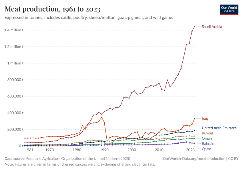 Food and Agriculture Organization of the United Nations (2025) – with major processing by Our World in Data. “Total meat production – UN FAO” [dataset]. Food and Agriculture Organization of the United Nations, “Production: Crops and livestock products” [original data]. Retrieved December 6, 2025 from https://archive.ourworldindata.org/20251014-161652/grapher/meat-production-tonnes.html (archived on October 14, 2025).