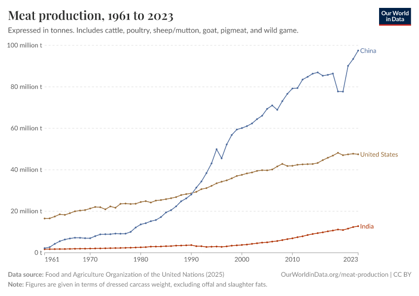 Food and Agriculture Organization of the United Nations (2025) – with major processing by Our World in Data. “Total meat production – UN FAO” [dataset]. Food and Agriculture Organization of the United Nations, “Production: Crops and livestock products” [original data]. Retrieved December 12, 2025 from https://archive.ourworldindata.org/20251014-161652/grapher/meat-production-tonnes.html (archived on October 14, 2025).