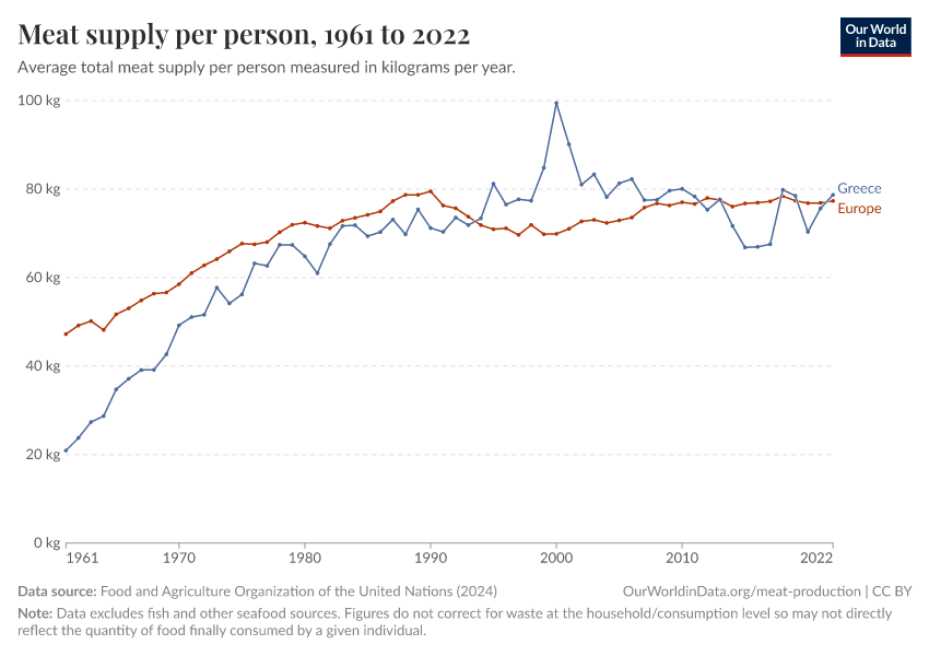 “Data Page: Yearly per capita supply of all meat”. Our World in Data (2025). Data adapted from Food and Agriculture Organization of the United Nations. Retrieved from https://archive.ourworldindata.org/20251128-120039/grapher/meat-supply-per-person.html [online resource] (archived on November 28, 2025).How to cite this data
